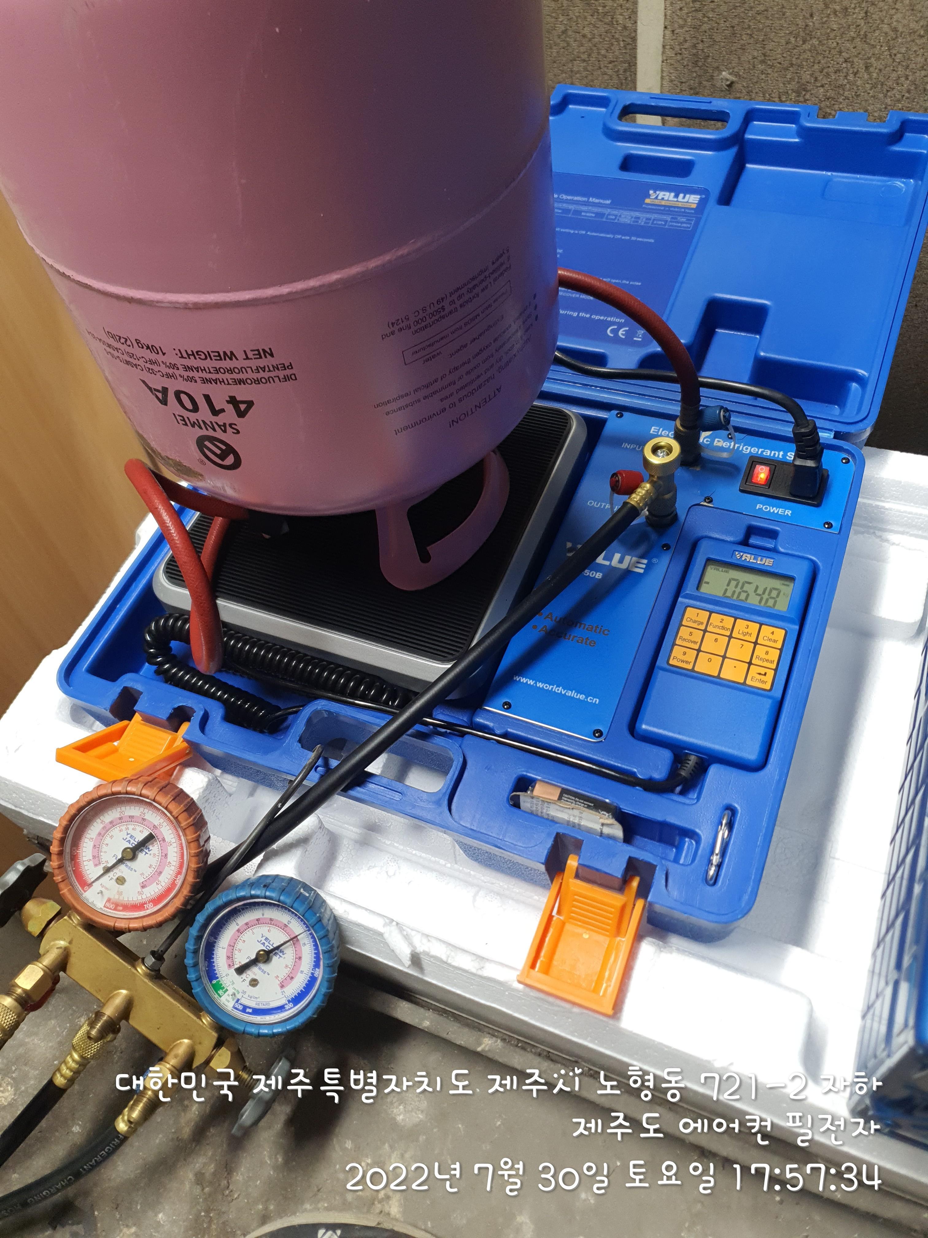 추가된 배관만큼 자동저울로 냉매 보충도 했습니다